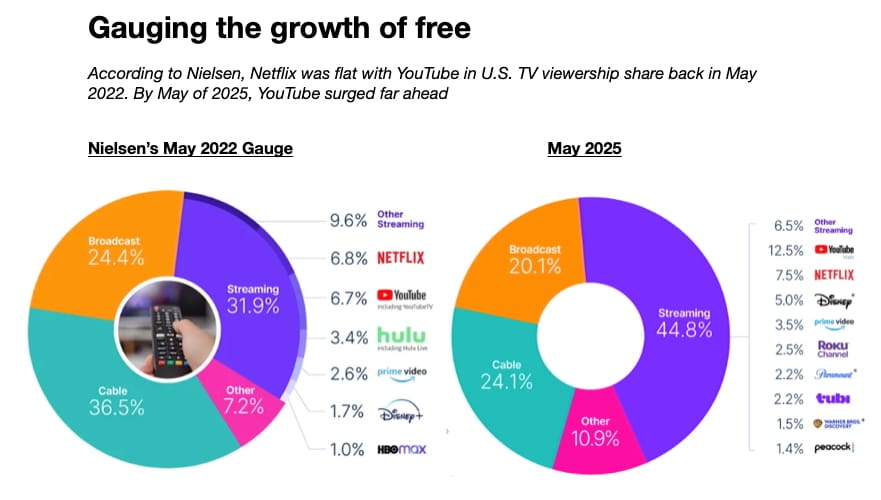 BLOOM: Yet another UCLA session featured Michael Nathanson’s brisk, data-dense presentation on the media landscape, with a coda on AI’s already massive impact: “We don’t want to understate this: We’re at the dawn of a new age powered by generative AI.” I hope everyone paid attention. Other tidbits: Entertainment spending from traditional media companies peaked in 2022. It won’t recover to those levels until at least 2027, and then mostly because of ever-rising sports rights costs, Nathanson said. Non-sports spending will drop 1%, to an industry-wide total of $102.8 billion. That’s a lot of money, but less than flat isn’t great for those new filming incentives. And while theatrical exhibition may be headed to a post-pandemic best box office gross in 2025 ($9.4 billion), something has changed, Nathanson suggested. Even Hollywood’s go-to sequels,. spinoffs and remakes aren’t “finding the traction they had pre-pandemic. In many ways, the hits just aren’t as big.” His thesis: as ticket prices arc skyward, “consumers have gotten smarter.” With so many more-convenient and affordable entertainment options, they pick their spots when it comes to moviegoing. Finally, Nathanson said “the real story of 2025 is the growth of free.” Three years ago, YouTube and Netflix were roughly even in minutes viewed. Now, YouTube is twice as big. “This online world led by YouTube keeps growing, growing, growing. It’s just the monster of all media.”