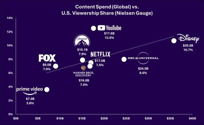 X-axis-ing content production spending versus Nielsen’s tally of aggregate U.S. viewership share, it’s probably good to hug that Y axis, as Amazon does. chart courtesy of Roku’s Michael Gross.