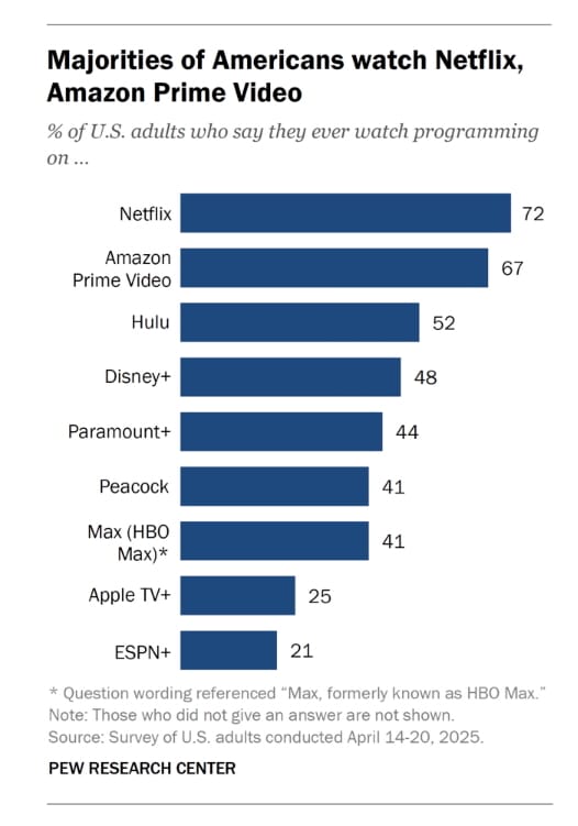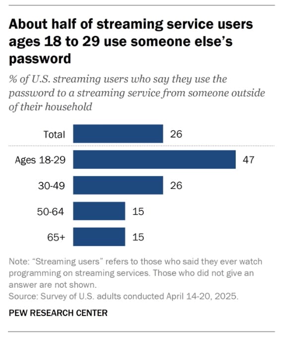 FRANKEL: I was sort of surprised that 44% of American adults say they watch Paramount+, ranking it just behind Disney+ on the use index’s higher side, according to an impressively girthed Pew Research Center survey of 9,397 consumers. Despite the vaunted password-sharing crackdown in the U.S., I was not surprised to see that 47% of young adults are still cribbing someone else’s SVOD account. I assume your solo holiday binge was paid by you, DB.