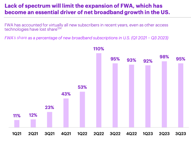 While the courts weigh the future of digital privacy, wireless lobbyist the Cellular Telephone Industries Association (CTIA), now led by former FCC Chair Ajit Pai, is pushing the federal government to release more spectrum. A new CTIA report by Accenture says that applications such as fixed wireless access will run out of spectrum next year unless the feds do something. Of course, creating panic helps Pai and CTIA do what they do. But FWA services from T-Mobile, Verizon and more recently AT&T have dominated residential broadband subscriber growth (while decimating cable company share prices) since 2022. The growth could stop if spectrum hits hard capacity limits (LightReading has a typically solid deep dive on spectrum issues here.) Notably, Altice USA — an MSO hit hard by fixed wireless competition — last week announced FastPass, a $25-a-month, 100 megabits-per-second-downstream service. After years of dismissing FWA as a passing fad, cable companies are finally doing something to compete with “cellphone internet.”