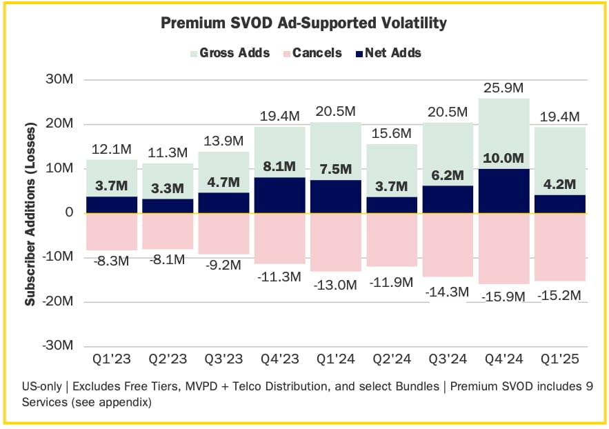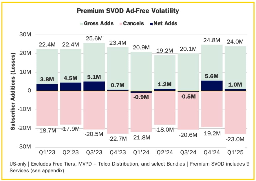 Conversely, churn for premium ad-free plans has been much higher. Over the last year, these zero-commercial SVOD services have averaged only 1.825 million additions per quarter.