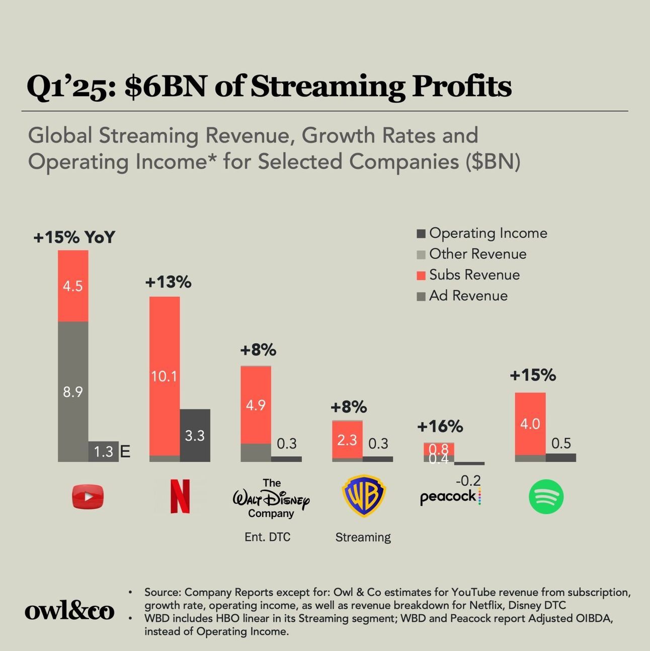 A collective $6 billion in profits from streaming video suggests (with some educated guesses) that nearly everyone is turning the corner. “All companies in the space have reported significant increases in operating income or EBITDA compared to a year ago,” Lopez wrote. “Netflix still leads the pack with $3.3B in profits, but YouTube, Disney, WBD and Spotify have collectively brought in $2.5B by my estimate (including YouTube, which doesn’t break out operating income or sub revenue).” Paramount+ lost a couple of hundred million dollars, sure, but even that’s a big improvement. Separately, Lopez hasn’t modeled Prime Video, “but industry sources suggest they’re also in the black.” Multiple strategies helped: bundles, ad-supported tiers, password crackdowns, international expansion, etc. Maybe that light at the end of the tunnel is blue skies, not an onrushing train: “When you're crossing the line from losses to profit in a largely fixed-cost business, improvements can come relatively fast.”