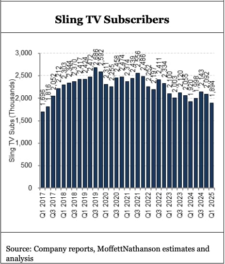 FRANKEL: To be more specific, Paramount’s DTC losses in Q1 totaled only $109 million, a 62% YoY reduction. The turnaround is remarkable, especially when you consider the narrative on SVOD just three years ago, as the graphic above shows. It was around this time that investors, suddenly awakened from the pandemic fog of the streaming wars, realized how expensive it was to launch these platforms and freaked out, sending share prices plummeting. Disney lost $11.4 billion on streaming from Disney+’s launch in November 2019 through April 2024. Just nine months later, in Q1, Disney generated a $336 million Q1 profit from Disney+, Hulu and ESPN+. Meanwhile, The White Lotus and The Pitt helped Warner Bros. generate a Q1 streaming profit of $339 million. Speaking of earnings, The Trade Desk patched up its fourth-quarter tiff with Wall Street. TTD stock rose nearly 25% after the biggest publicly traded advanced advertising company reported a 25% Q1 revenue bump. Not so at EchoStar, which continued its inexorable slide toward Chapter 11 oblivion. Not even Sling TV is growing anymore, losing nearly 200,000 subs in the first quarter.